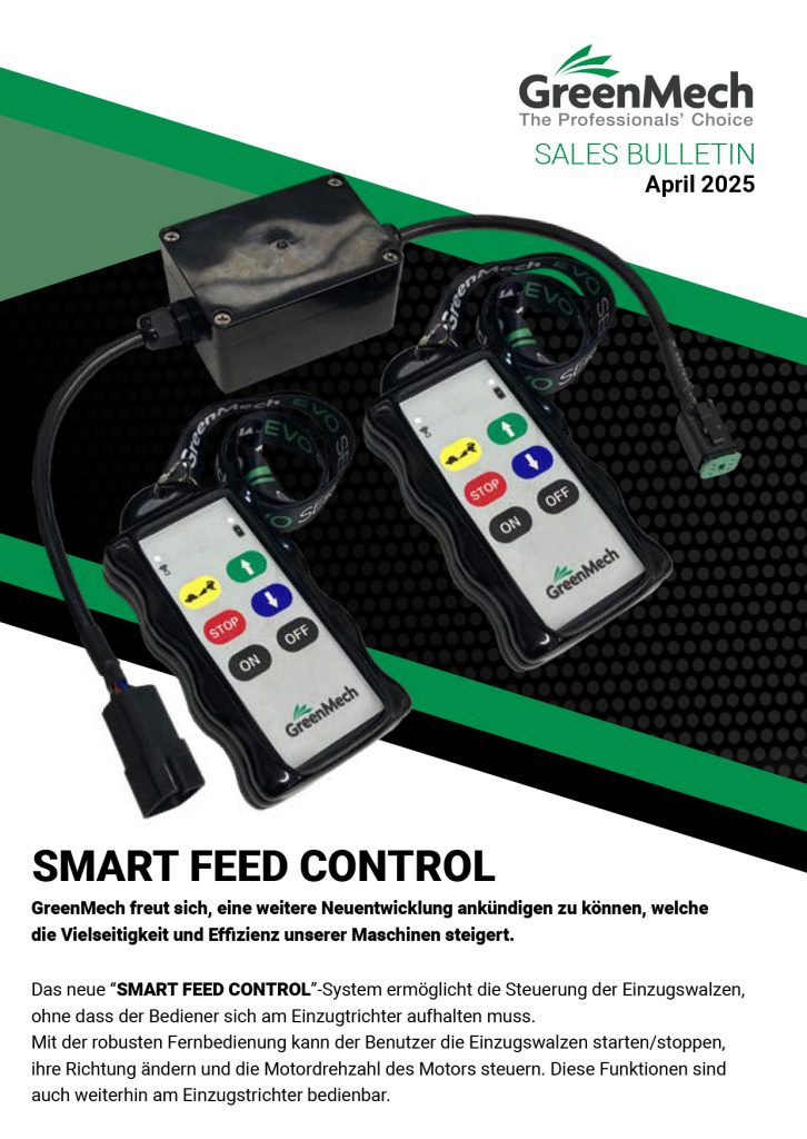 Das neue “SMART FEED CONTROL”-System ermöglicht die Steuerung der Einzugswalzen, ohne dass der Bediener sich am Einzugtrichter aufhalten muss. Mit der robusten Fernbedienung kann der Benutzer die Einzugswalzen starten/stoppen, ihre Richtung ändern und die Motordrehzahl des Motors steuern. Diese Funktionen sind auch weiterhin am Einzugstrichter bedienbar.